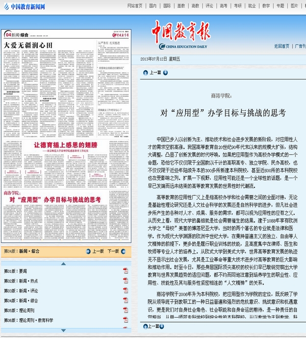 自2006年升本以來,我校著力圍繞發(fā)展、把握大局,適應(yīng)社會發(fā)展趨勢和對人才的需求,立足高等教育發(fā)展實(shí)際和自身定位,制定了建成特色鮮明、多學(xué)科協(xié)調(diào)發(fā)展的應(yīng)用型本科院校的辦學(xué)定位。7月12日,《中國教育報》刊登校黨委副書記左曉民署名文章《商洛學(xué)院:對“應(yīng)用型”辦學(xué)目標(biāo)與挑戰(zhàn)的思考》,介紹了我校應(yīng)用型的辦學(xué)定位與目標(biāo),從辦學(xué)理念、辦學(xué)體系、制度創(chuàng)新等方面闡述了對建設(shè)應(yīng)用型本科高校的思考。