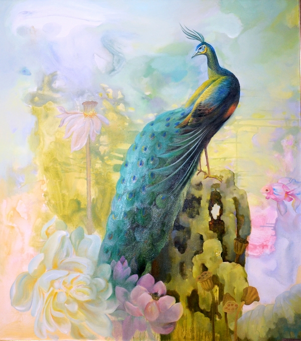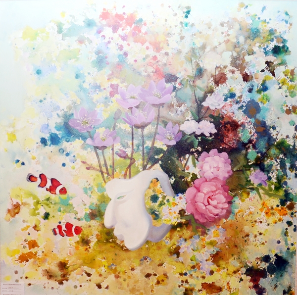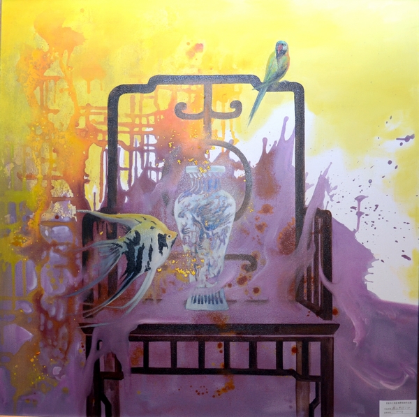 楊靜的作品多以意象風(fēng)景為主,魚、飛鳥、椅子、面具、鮮花常常成為畫面中的主要視覺符號,意象化的表述方式是其繪畫語言特點(diǎn),獨(dú)具視覺張力的畫面背后蘊(yùn)藏著或浪漫或神秘或抒情的藝術(shù)獨(dú)白。她的作品,一切似乎都是從畫布的縫隙間不經(jīng)意地流淌、蔓延而出,生發(fā)、幻化出諸多“意外之境”,堅實的文化底蘊(yùn)與繪畫技能,獨(dú)到的藝術(shù)眼界和隨機(jī)靈動的“深思妙悟”,賦予畫面中各種意象生命,讓畫內(nèi)的意象引領(lǐng)聯(lián)想畫外意象,達(dá)成“象外之象,景外之景”的效果,結(jié)合自己的生命體驗詮釋對當(dāng)代人及其生存環(huán)境的思索與追問,在虛實相生之間營造一個全新的美好境界。本次畫展共展出作品50多件,且全部被3家藝術(shù)投資機(jī)構(gòu)收藏。