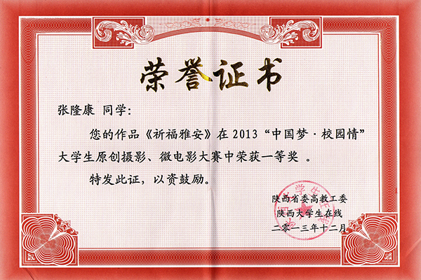 2013“中國夢?校園情”大學生原創(chuàng)攝影、微電影大賽由陜西省委高教工委和陜西大學生在線主辦,西北政法大學承辦,西安交通大學、西北農(nóng)林科技大學、西北工業(yè)大學、長安大學、西北大學、西安工程大學、西安文理學院、西安體育學院、西安翻譯學院協(xié)辦。大賽旨在深入貫徹落實十八大精神,推動校園網(wǎng)絡(luò)文化建設(shè),提升陜西大學生的文化品位,豐富大學生的校園生活,宣傳和展示高校人文文化氛圍。大賽累計收到全省27所高校師生網(wǎng)上投稿作品3252幅,最終評選出攝影作品一等獎5名,二等獎10名,三等獎13名,優(yōu)秀獎14名;微電影作品一等獎1名,二等獎2名,三等獎3名,優(yōu)秀獎15名。