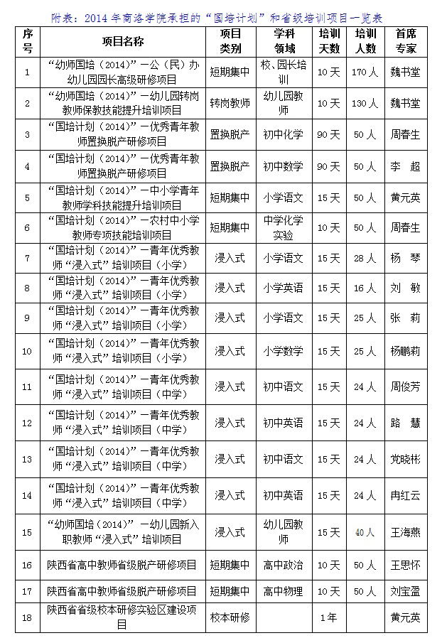 2014年,我校通過前期調(diào)研、方案研制、項(xiàng)目答辯、教育部專家評(píng)審等環(huán)節(jié),最終獲批18項(xiàng)“國培計(jì)劃”和省級(jí)培訓(xùn)項(xiàng)目(詳見附表)。本次獲批的18個(gè)項(xiàng)目涵蓋基礎(chǔ)教育的各個(gè)學(xué)段,分別由我校獨(dú)立承擔(dān)或與商洛市教育局、商洛市小學(xué)、山陽縣城區(qū)第二小學(xué)、商州區(qū)中學(xué)、丹鳳縣龍駒初級(jí)中學(xué)、洛南縣城關(guān)中學(xué)、商南縣幼兒園聯(lián)合承擔(dān)。