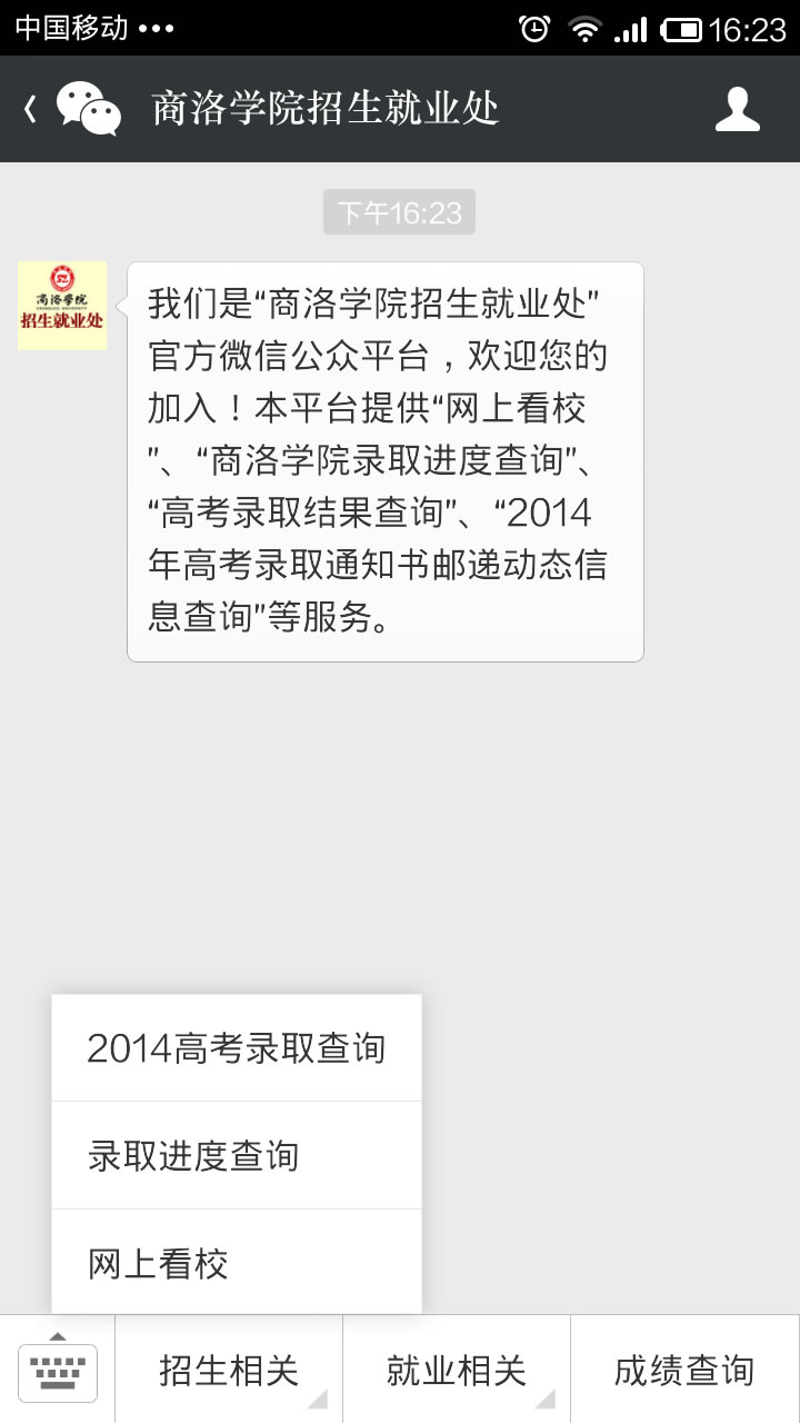 2014年4月,我校招生就業(yè)處開通微信公眾平臺(tái)和高考通知書郵遞查詢系統(tǒng)(http://www.sxsssy.com/cx/),考生及家長可在填報(bào)志愿期間直接通過微信公眾平臺(tái)實(shí)現(xiàn)網(wǎng)上看校直通車服務(wù),高考錄取期間查詢“商洛學(xué)院錄取動(dòng)態(tài)和結(jié)果”,錄取后可查詢“錄取通知書郵遞動(dòng)態(tài)信息”。