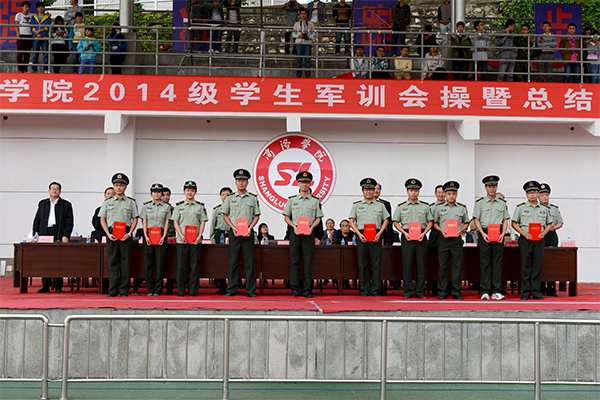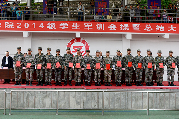 軍訓(xùn)匯報表演結(jié)束后,石啟英宣讀了2014級軍訓(xùn)工作先進集體及個人的表彰決定。主席臺上的領(lǐng)導(dǎo)和嘉賓為軍訓(xùn)隊列先進集體、軍訓(xùn)內(nèi)務(wù)先進集體、軍訓(xùn)優(yōu)秀教官、軍訓(xùn)工作先進個人及參訓(xùn)優(yōu)勝標兵代表頒發(fā)了獎牌和證書。