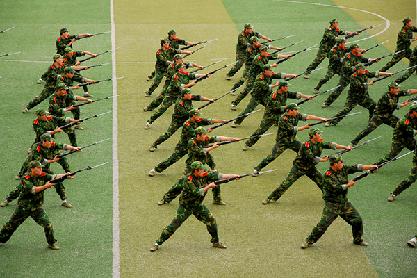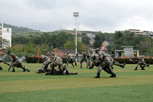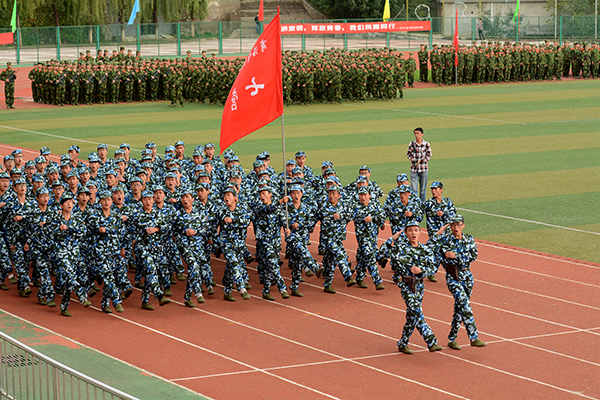 伴隨著著激昂奮進的《檢閱進行曲》,校長劉建林檢閱了軍訓(xùn)團全體學(xué)生。軍訓(xùn)團各連組成24個受閱方陣,以嚴整的軍容軍姿依次通過主席臺。同學(xué)們口號嘹亮、動作整齊、步伐穩(wěn)健、英姿颯爽,充分展現(xiàn)了我校學(xué)生的精神風(fēng)貌。今年的分列式增加了持槍方陣、刺刀方陣、衛(wèi)生兵方陣和海軍方陣,具有更強的視覺效果和沖擊力。分列式結(jié)束后,我校學(xué)生進行了刺殺操、花樣隊列和軍體拳匯報表演。男子刺殺操動作整齊利落、殺氣騰騰,展示了壓倒一切敵人的英雄氣概;由600人表演的軍體拳節(jié)奏分明、套路連貫、氣勢磅礴、喊殺聲震天,贏得了現(xiàn)場陣陣熱烈的掌聲。軍訓(xùn)教官也進行了精彩的單兵班排戰(zhàn)術(shù)和擒敵拳表演,將大會氣氛推向了高潮。