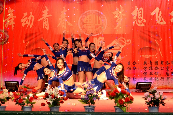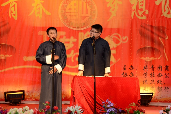 當(dāng)晚的大學(xué)生活動中心張燈結(jié)彩,喜氣洋洋,洋溢著歡快的節(jié)日氣氛。晚會在《讓我們舞起來》歌伴舞的精彩表演中拉開序幕,歌舞、相聲、小品、魔術(shù)、朗誦等16個形式多樣、精彩紛呈的節(jié)目贏得了臺下觀眾們的陣陣喝彩。其中,由街舞學(xué)社選送的舞蹈《keep On Dancing》,用動感的舞步和滑稽的肢體語言顯示了同學(xué)們豐富多彩的校園生活和活潑陽光的青春風(fēng)采;漢服學(xué)社的同學(xué)們邁著輕快靈動、曼妙翩躚舞姿,用一支《重回漢唐》展示了漢代文化的博大精深;相聲《學(xué)富五車》語言詼諧幽默,表演者們精彩的表演贏得了全場熱烈的掌聲;被同學(xué)們冠以“樓姨”昵稱的宿舍管理員用一場《歡樂草原》的舞蹈將晚會氣氛的推向高潮。藝術(shù)學(xué)院的五位老師一首富有戲劇性的歌曲聯(lián)唱,展現(xiàn)了我校老師嚴(yán)肅又不失活潑的精神風(fēng)貌。