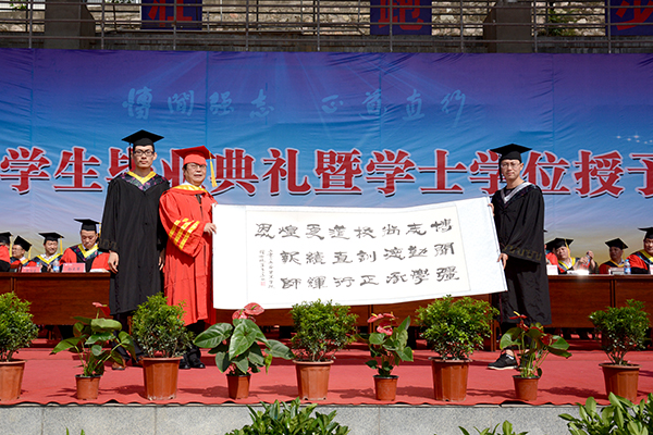 畢業(yè)典禮暨學(xué)士學(xué)位授予儀式在莊嚴(yán)的國(guó)歌聲中開始。為了感謝母校的培育之恩,全體2015屆畢業(yè)生向母校贈(zèng)送書法作品“博聞強(qiáng)志勤學(xué)尚德承校訓(xùn) 正道直行更續(xù)輝煌報(bào)師恩”,作為永久的紀(jì)念,張景書代表學(xué)校接受了禮物。