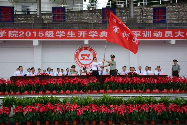 驕驕學子,今登堂明入室,星夜兼程圓好夢;巍巍黌門,才送往又迎來,躬耕不輟育國魂。9月8日,我校隆重舉行2015級學生開學典禮暨軍訓動員大會。校領(lǐng)導張景書、劉建林、王思懷、魏書堂、彭虎軍、范新會、劉寶盈,解放軍西安政治學院黨委常委、院務(wù)部部長邱仕偉大校,解放軍西安政治學院政治部副主任張新軍大校,解放軍西安政治學院軍事系教授、學生軍訓團團長劉京生大校,商洛市人民政府副秘書長宋奇志出席了大會。校黨委書記張景書向承訓教官授2015級學生軍訓團團旗,校黨委副書記、校長劉建林作了重要講話。大會由校黨委副書記彭虎軍主持。各院部黨政負責人、各職能部門負責人與2015級新生參加了大會。