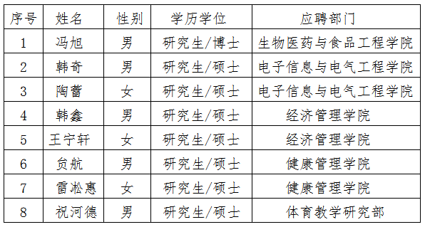 根據(jù)陜西省人社廳《關(guān)于陜西省事業(yè)單位公開招聘人員辦法》規(guī)定及《商洛學院2020年人才招聘計劃》,經(jīng)過資格審查、試講、專家面試等環(huán)節(jié)考察,并經(jīng)院長辦公會2019年12月12日研究,同意招聘馮旭等8位同志來我校工作,現(xiàn)予以公示。如有異議,請于2019年12月18日前向人事處或紀委辦公室反映。