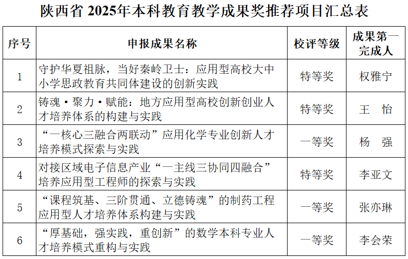 根據(jù)《關(guān)于開展2025年高等教育教學(xué)成果獎評審工作的通知》(陜教函〔2025〕688號)文件精神,我校認(rèn)真組織開展高等教育教學(xué)成果獎申報工作,經(jīng)各教學(xué)單位推薦,校內(nèi)外專家評審,學(xué)校教學(xué)工作委員會審定,擬推薦《聚守護(hù)華夏祖脈,當(dāng)好生態(tài)衛(wèi)士:秦嶺腹地大中小學(xué)思想政治教育一體化建設(shè)的創(chuàng)新實踐》等6個項目(見下表)申報2025年陜西省高等教育教學(xué)成果獎,現(xiàn)予以公示。