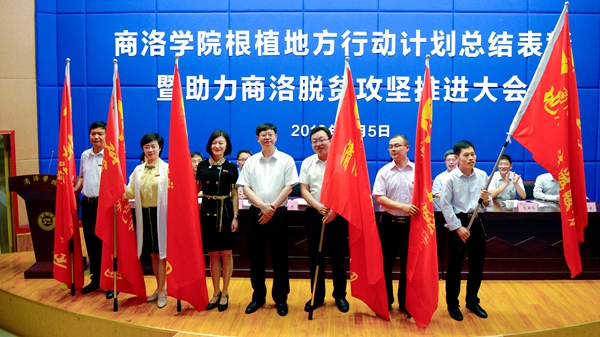 張禮進(jìn)為我校助力商洛脫貧攻堅人才服務(wù)團(tuán)授旗并講話。他代表中共商洛市委、商洛市人民政府,向本次大會的召開表示祝賀,向我校教師致力于把科研的“根須”扎進(jìn)商山洛水、為創(chuàng)新美麗幸福商洛建設(shè)做出的努力實踐表示感謝。他指出,商洛學(xué)院作為全市唯一的全日制本科院校,在加快自身發(fā)展的同時,認(rèn)真履行服務(wù)地方使命,為全市產(chǎn)業(yè)升級和教育扶貧提供了強有力的智力支撐、人才支持和科技服務(wù)。他希望我校以本次大會為契機,進(jìn)一步總結(jié)經(jīng)驗、把準(zhǔn)方向,不斷深化“根植地方行動計劃”,更高質(zhì)量推動校地、校企深度融合,加快推進(jìn)科技創(chuàng)新和成果轉(zhuǎn)化,積極投身商洛精準(zhǔn)脫貧攻堅戰(zhàn),繼續(xù)為“三個商洛”建設(shè)譜寫精彩華章。