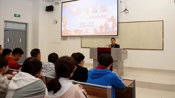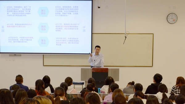 校領(lǐng)導(dǎo)們以習(xí)近平新時(shí)代中國特色社會(huì)主義思想為指導(dǎo),結(jié)合青年學(xué)生成長(zhǎng)階段特點(diǎn),融匯文史哲等多個(gè)學(xué)科知識(shí),用深邃的歷史眼光和寬廣的世界視野為學(xué)生細(xì)致剖析了中美經(jīng)貿(mào)摩擦的過程、本質(zhì)、原因、影響、中國的立場(chǎng)及策略。他們用風(fēng)趣生動(dòng)的語言、豐富的教學(xué)案例、精美的多媒體課件,教育引導(dǎo)廣大學(xué)子自覺肩負(fù)起時(shí)代發(fā)展大任,堅(jiān)定理想信念,厚植愛國主義情懷,發(fā)揚(yáng)斗爭(zhēng)精神,增強(qiáng)“四個(gè)自信”,進(jìn)一步把思想和行動(dòng)統(tǒng)一到中央決策部署上來,把愛國熱情轉(zhuǎn)化為艱苦斗爭(zhēng)、振興中華的理性認(rèn)識(shí)和具體行動(dòng),以學(xué)習(xí)為最大任務(wù),在學(xué)習(xí)中增長(zhǎng)知識(shí)、錘煉品格,在實(shí)踐中增長(zhǎng)才干、練就本領(lǐng),以真才實(shí)學(xué)服務(wù)人民,以創(chuàng)新創(chuàng)造貢獻(xiàn)國家。