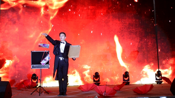 “家是最小國,國是千萬家”,臺下觀眾揮舞手中的小國旗與臺上演員熱情互動,在合唱歌曲《國家》的歌聲中表達中華兒女拳拳愛國情。哪有什么歲月靜好,只是有人替你負重前行,《我要去北京》以小品的方式致敬退伍老兵。靈動的少女在神秘的山林、悠揚的曲調(diào)中跳起《傣族舞韻》,電音歌曲《沒有理想的人不傷心》用跳動的音符震撼全場,舞蹈《映山紅》再現(xiàn)了那段崢嶸的紅色歲月,街舞《Swallow》再次引爆現(xiàn)場的歡呼聲、尖叫聲。神秘的魔術(shù)師和可愛的小丑共同帶來魔術(shù)表演《魔幻色彩》,帶給觀眾歡樂和驚嘆。以下雪的故宮為背景的歌舞表演《雪落下的聲音》,歌聲甜美、舞蹈優(yōu)雅、意境深遠,讓人賞心悅目。師生同臺表演的武術(shù)《風(fēng)云聚》集太極、格斗、跆拳道、雙截棍、散打為一體,展現(xiàn)了中華武術(shù)深邃的文化意蘊。在歌伴舞《不忘初心》悠揚的旋律中,晚會圓滿落幕,領(lǐng)導(dǎo)嘉賓與全體演職人員合影留念,共同祝愿商洛學(xué)院在新的一年逐夢前行、再創(chuàng)輝煌。
