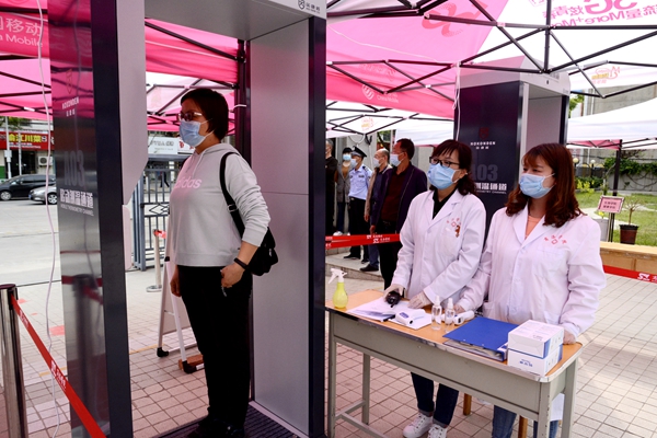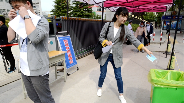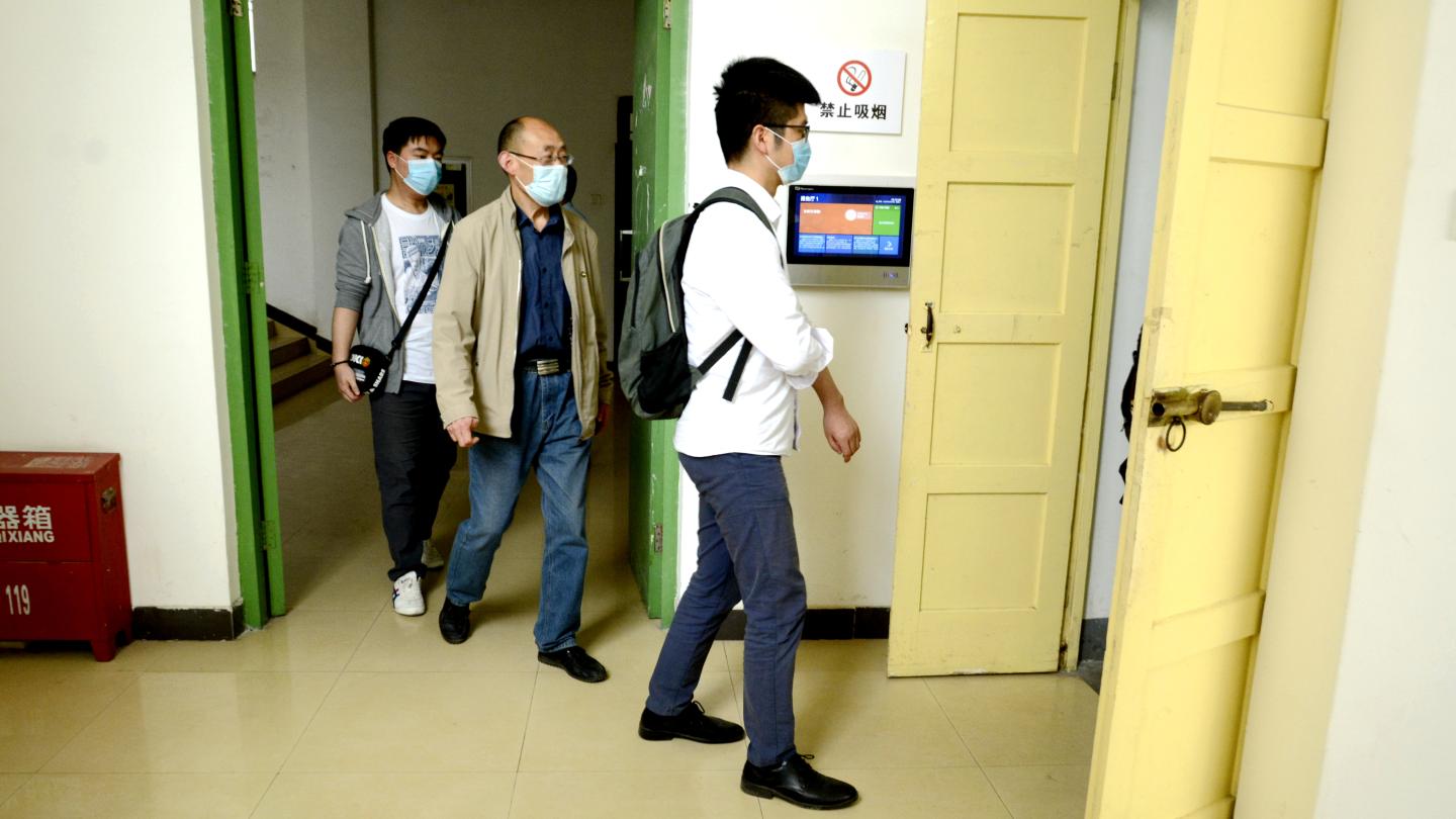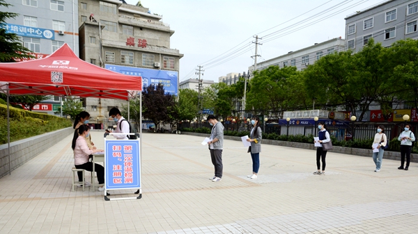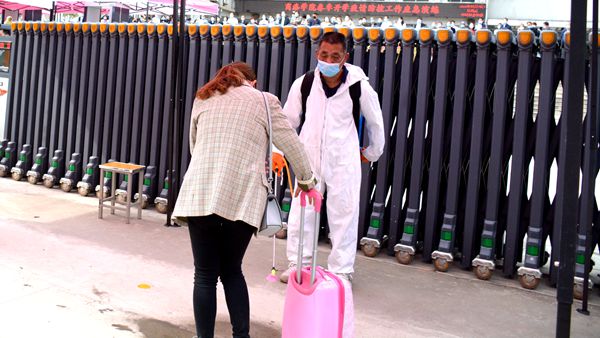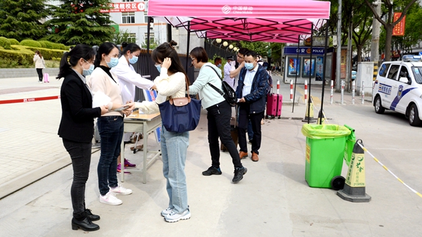 隨著龍治剛“演練開始”一聲令下,緊張有序的演練正式拉開帷幕,幾十余名“學生”在學校大門口外保持1.5米間隔依次進入消毒通道,卸下舊口罩投棄到專用垃圾箱后佩戴工作人員配發(fā)的一次性醫(yī)用口罩,經(jīng)工作人員查驗有效證件后進入校門口自動測溫門,進行第一次體溫檢測。體溫檢測正常的學生按照指示線到一號教學樓前的各學院接待點接受二次體溫檢測、掃描驗證健康二維碼、填寫健康承諾書。