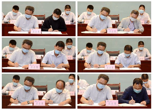 黨委書記龍治剛與職能部門、教學(xué)院(部)負(fù)責(zé)人代表分別簽訂了2020年度《全面從嚴(yán)治黨責(zé)任書》《意識(shí)形態(tài)工作責(zé)任書》和《穩(wěn)定安全工作責(zé)任書》。黨委副書記、校長(zhǎng)范新會(huì)主持會(huì)議,黨委副書記彭虎軍宣讀表彰文件。
