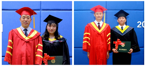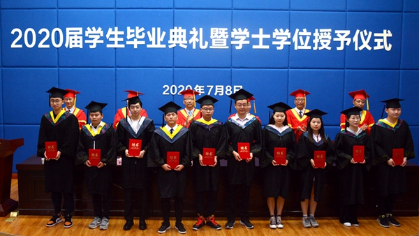 畢業(yè)典禮在校歌《正道直行做棟梁》中圓滿結束。在隨后舉行的學士學位授予儀式上,畢業(yè)生們依次走上主席臺,黨委副書記彭虎軍、副校長劉勇分別為獲得學士學位的畢業(yè)生正冠撥穗、頒發(fā)學位證書,并與同學們合影留念。