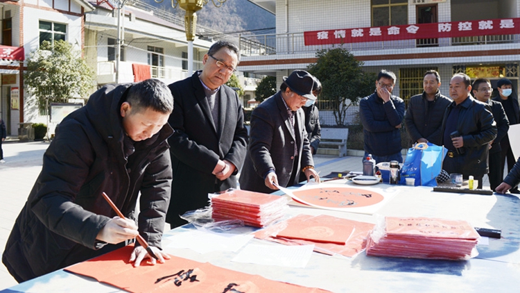 活動(dòng)期間,我校書(shū)法家協(xié)會(huì)副主席、陜西毛體書(shū)法藝術(shù)研究院副院長(zhǎng)劉全民,藝術(shù)學(xué)院教師張長(zhǎng)林現(xiàn)場(chǎng)展紙揮毫,為群眾書(shū)寫(xiě)、贈(zèng)送春聯(lián),送去新春祝福。慕名前來(lái)的群眾絡(luò)繹不絕,爭(zhēng)相收藏自己喜愛(ài)的春聯(lián),大家笑顏綻放,為和坪村帶來(lái)了濃濃的年味和文化氣息。