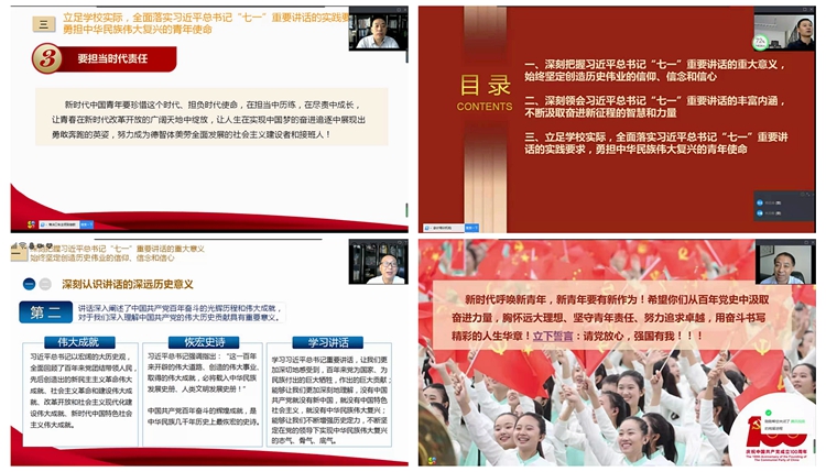 校領(lǐng)導(dǎo)的授課主題鮮明、內(nèi)容豐富、深入淺出、各具特色,既有理論高度,又有思想深度,并靈活引用了《習(xí)近平講故事》和《習(xí)近平用典》中的鮮活事例,分析透徹、引人入勝,對廣大師生深入學(xué)習(xí)貫徹習(xí)近平總書記“七一”重要講話精神具有很強(qiáng)的指導(dǎo)性。授課期間,廣大學(xué)生紛紛通過在線平臺(tái)為校領(lǐng)導(dǎo)點(diǎn)贊,并在留言中踴躍抒發(fā)自己加強(qiáng)黨史學(xué)習(xí)、立志成才、勇?lián)褡鍙?fù)興大任的信心和決心。