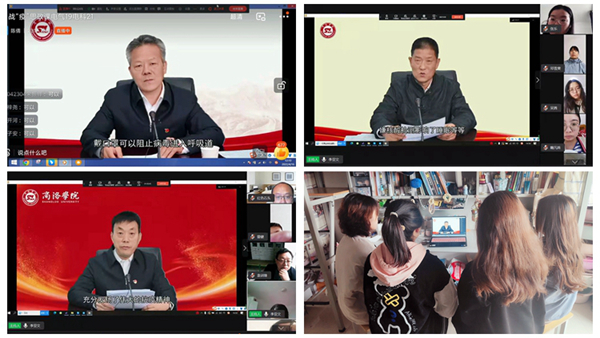 為進(jìn)一步鞏固疫情防控工作成果,弘揚(yáng)偉大抗疫精神,提振師生戰(zhàn)“疫”必勝的信心和決心,4月16日,我校組織開展萬名師生同上一堂戰(zhàn)“疫”專題思政課活動(dòng)。各二級(jí)學(xué)院黨委、黨總支通過釘釘平臺(tái)搭建線上課堂,校領(lǐng)導(dǎo)張志昌、范新會(huì)、彭虎軍以及醫(yī)務(wù)室負(fù)責(zé)人任秀梅通過“云端交流”的方式,為全校萬余名師生解讀疫情防控政策,宣講防疫知識(shí),分析疫戰(zhàn)“疫”斗爭中彰顯出的中國共產(chǎn)黨領(lǐng)導(dǎo)和中國特色社會(huì)主義制度的顯著優(yōu)勢(shì),引導(dǎo)廣大青年學(xué)生樹立責(zé)任擔(dān)當(dāng)意識(shí),激發(fā)愛黨愛國愛社會(huì)主義深厚情懷。