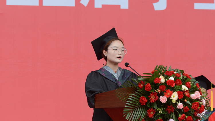 畢業(yè)生代表、化學工程與現(xiàn)代材料學院學生田思雨分享了自己四年來的奮斗和收獲,并代表2022屆畢業(yè)生向學校領導和老師致以最崇高的敬意和最衷心的感謝!她說,我們即將走向更加寬廣的天地,到不同的行業(yè)和崗位中,以真才實學服務人民、以創(chuàng)新創(chuàng)造貢獻國家。吾輩當廣才志以求進,摶扶搖而直上,奮力譜寫精彩的青春華章,做百年新夢想的引領者和逐夢人!