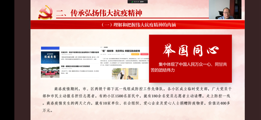 校長范新會在講授中引用多個鮮活事例,生動形象地闡述了生命至上、舉國同心、舍生忘死、尊重科學(xué)、命運(yùn)與共的偉大抗疫精神內(nèi)涵,系統(tǒng)性總結(jié)了中國戰(zhàn)“疫”取得的偉大成就。結(jié)合近期國內(nèi)、我省和商州區(qū)等疫情防控形勢,范新會強(qiáng)調(diào),青年學(xué)生要深刻理解和傳承弘揚(yáng)偉大抗疫精神,把握偉大抗疫精神的內(nèi)涵。一是要肩負(fù)使命擔(dān)當(dāng),與祖國和人民同呼吸共命運(yùn)。青年學(xué)生要把學(xué)問做在祖國大地上,做接地氣的真學(xué)問,要到祖國和人民最需要的地方去摸爬滾打,在疫情防控、科技創(chuàng)新、鄉(xiāng)村振興中發(fā)光發(fā)熱,從中找到人生真諦、生命價值和事業(yè)方向。二是要厚植愛國情懷,做積極戰(zhàn)“疫”的先行者。青年學(xué)生要帶頭遵守疫情防控各項要求,主動傳播疫情防控權(quán)威信息,分享正能量抗疫故事,解讀疫情防控方針政策。要敢于挺身而出,發(fā)揮所長、盡己所能為防控工作助力。要服從組織安排,落實安全防護(hù),規(guī)范有序參與疫情防控志愿服務(wù),在筑牢校園、社區(qū)防疫屏障中,展現(xiàn)商洛學(xué)院人應(yīng)有的昂揚(yáng)斗志和青春力量。