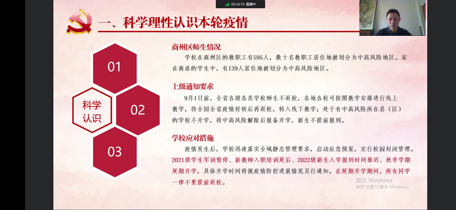 為深化大學(xué)生思想政治教育,強(qiáng)化師生疫情防控意識,引導(dǎo)廣大青年學(xué)生嚴(yán)格落實疫情防控各項工作要求,弘揚(yáng)偉大抗疫精神,以實際行動迎接黨的二十大勝利召開,8月31日下午,校領(lǐng)導(dǎo)張志昌、范新會、彭虎軍、劉勇、劉寶盈、王新軍、郭瑾以“云端授課”的形式,為全體學(xué)生講授“開學(xué)第一課”。