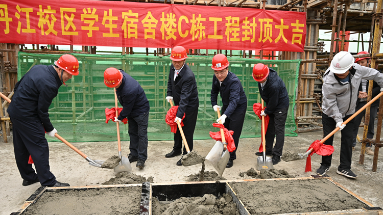 在熱烈的掌聲中,張志昌宣布丹江校區(qū)學生宿舍樓C棟樓順利封頂。校領導和與會嘉賓鏟起混凝土為項目封頂,共同見證了本項目最后一塊混凝土板的澆筑過程。