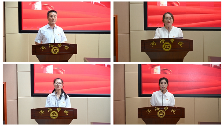 優(yōu)秀基層黨組織代表、經(jīng)管學(xué)院黨委書(shū)記高擴(kuò)昌,優(yōu)秀黨務(wù)工作者代表、電信學(xué)院學(xué)工辦主任陳倩,優(yōu)秀教工黨員代表、建工學(xué)院教師曹琛,優(yōu)秀學(xué)生黨員代表、健康管理學(xué)院護(hù)理2221班學(xué)生申愛(ài)霞分別作了交流發(fā)言。