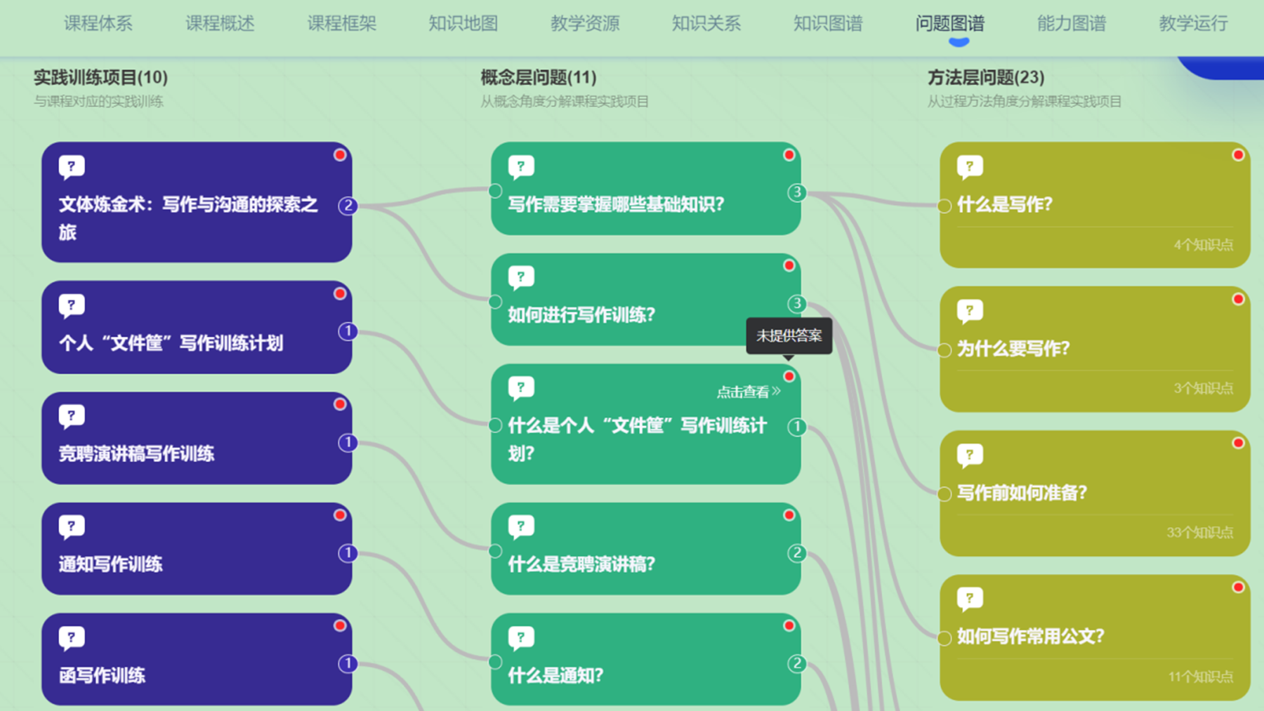 與傳統(tǒng)的視頻課程資源建設(shè)相比,知識(shí)圖譜課程更加智慧化、數(shù)智化,將可視化的課程體系呈現(xiàn)給師生,幫助教師在教學(xué)中更好地服務(wù)學(xué)生。課程采用工作情景模擬和角色意識(shí)提升的方法,將寫作理論置于實(shí)際情境中,以溝通為寫作核心,設(shè)計(jì)具有挑戰(zhàn)性的任務(wù)和項(xiàng)目,凸顯課程兩大特點(diǎn):學(xué)法創(chuàng)新——寫作“文件筐”訓(xùn)練法強(qiáng)化學(xué)生自我管理;成果導(dǎo)向——加深學(xué)生學(xué)習(xí)過程體驗(yàn),提升其寫作能力與溝通能力。同時(shí),引入教育教學(xué)AI,將現(xiàn)有的課程資源進(jìn)行碎片化再利用,給學(xué)生更多的學(xué)習(xí)資源選擇和路徑選擇。學(xué)生可基于知識(shí)點(diǎn)及關(guān)鍵詞,使用AI檢索教學(xué)資源;教師可利用AI技術(shù),分析學(xué)生的學(xué)習(xí)行為和學(xué)習(xí)結(jié)果,綜合判斷學(xué)生對(duì)知識(shí)點(diǎn)的掌握度,更加精準(zhǔn)地掌握學(xué)情,實(shí)現(xiàn)更好地“備學(xué)生”。