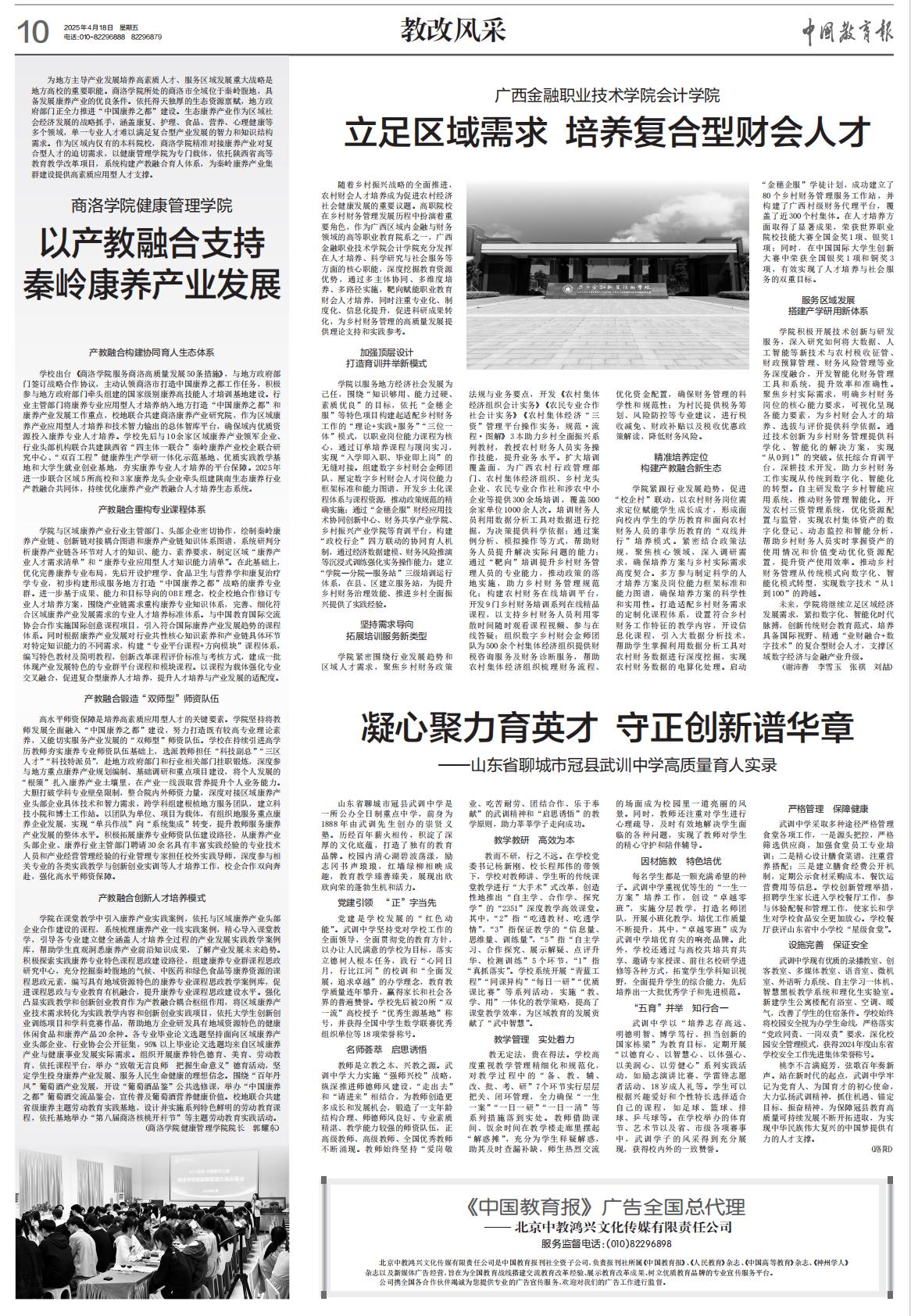 4月18日,《中國教育報》“教改風采”版面刊發(fā)專題報道《商洛學院健康管理學院以產(chǎn)教融合支持秦嶺康養(yǎng)產(chǎn)業(yè)發(fā)展》。文章從構建協(xié)同育人生態(tài)體系、重構專業(yè)課程體系、鍛造“雙師型”師資隊伍、創(chuàng)新人才培養(yǎng)模式四個方面全面介紹了我校深化產(chǎn)教融合、助力人才培養(yǎng),積極協(xié)助地方政府打造“中國康養(yǎng)之都”的特色創(chuàng)新舉措。