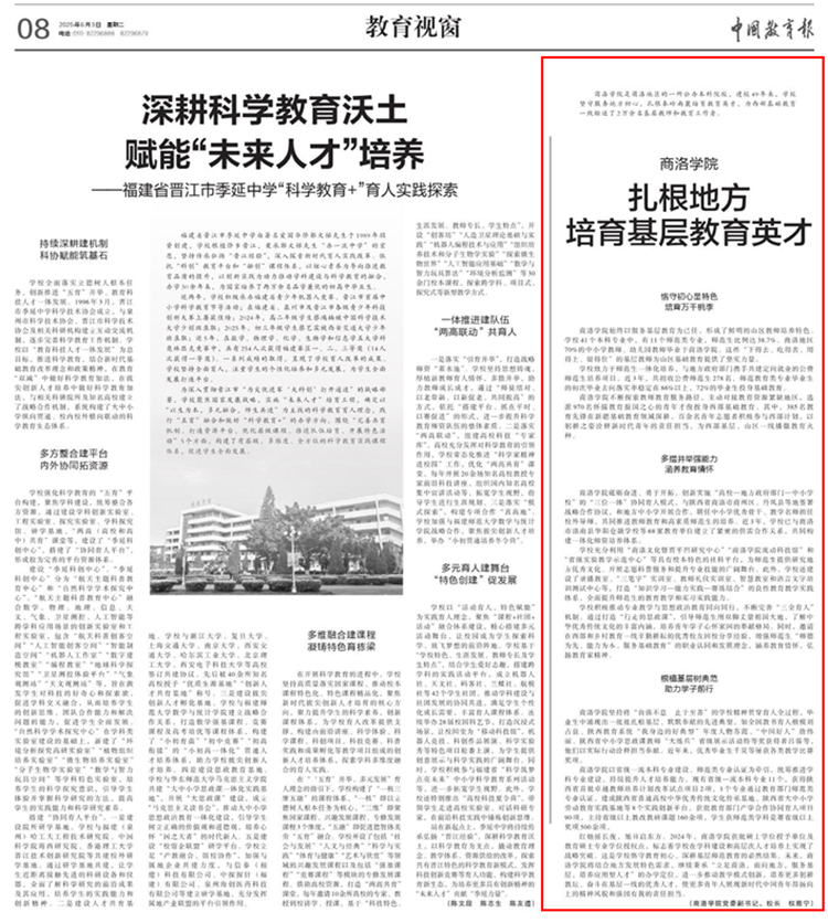 6月3日,《中國(guó)教育報(bào)》“教育視窗”欄目刊發(fā)了校長(zhǎng)權(quán)雅寧署名文章《商洛學(xué)院扎根地方培育基層教育英才》,對(duì)我校扎根秦嶺培育教育人才的經(jīng)驗(yàn)成果進(jìn)行了專(zhuān)題報(bào)道。