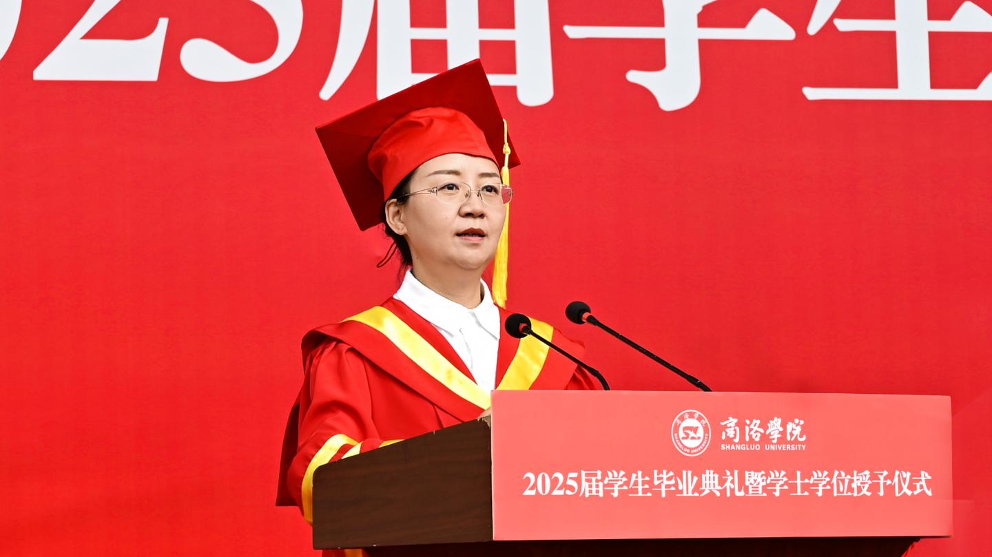 校長權(quán)雅寧以《矢志篤行勵青春 奮楫揚帆啟新程》為題發(fā)表了情真意切的講話。她指出,四年時光里,同學(xué)們與學(xué)校共成長、同進(jìn)步,涌現(xiàn)出了一大批投身軍營、奔赴邊疆、銳意創(chuàng)業(yè)、考研深造、支援山區(qū)的優(yōu)秀學(xué)子,參與見證了學(xué)校黨建工作實現(xiàn)國字號突破、順利通過教育部本科教育教學(xué)審核評估、成功獲批碩士學(xué)位授予單位等最新成就和重大突破。她寄語全體畢業(yè)生,一要堅持“終身學(xué)習(xí)”,勇立時代潮頭。以跨界思維打破學(xué)科壁壘,用開放胸懷擁抱知識迭代,讓學(xué)習(xí)成為融入血脈的習(xí)慣。二要正確認(rèn)識自己,創(chuàng)造美好生活。不陷于“內(nèi)卷”的焦慮,也不沉溺“躺平”的虛無,傾聽內(nèi)心的聲音,找到屬于自己生命的獨特節(jié)奏與價值高峰。三要錘煉堅韌品格,直面人生挑戰(zhàn)。順境時不可驕縱自滿,逆境時切勿輕言放棄,以“風(fēng)雨兼程”的勇氣、“堅韌不拔”的意志、“披荊斬棘”的行動,去迎接每一次挑戰(zhàn),跨越每一道溝壑。