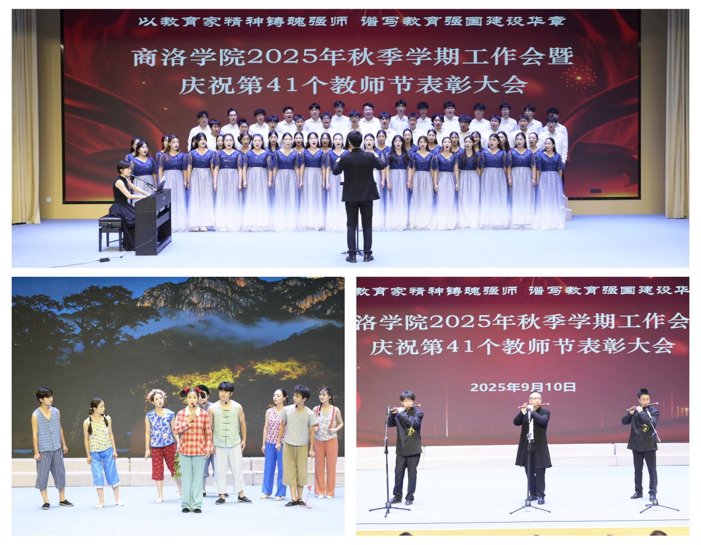 藝術(shù)學(xué)院師生會(huì)前表演了商洛花鼓《月亮光光》選段《追趕星星和月亮》、笛子合奏《揚(yáng)鞭催馬運(yùn)糧忙》、合唱《飛來的花瓣》等文藝節(jié)目,師生共同歡慶節(jié)日。