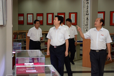 在校領(lǐng)導(dǎo)劉建林、王思懷、魏書堂、彭虎軍、劉寶盈的陪同下,莊長興一行視察了我校校園環(huán)境和特色展室。