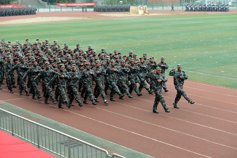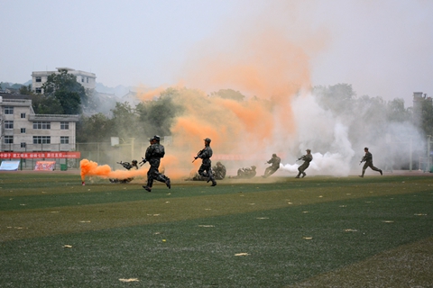 分列式結(jié)束后,我校學(xué)生進行了隊列隊形、軍體拳和反恐戰(zhàn)術(shù)匯報表演。伴隨著悠揚的旋律,女兵用花束排出了巨大的“1976”“2016”等字樣,慶祝我校建校40周年。同學(xué)們還擺出了“商院夢 中國夢”“不忘初心 繼續(xù)前進”等造型,表達我校學(xué)生秉承校訓(xùn),刻苦學(xué)習(xí),報效祖國的堅定信念。由男兵表演的軍體拳動作精煉、節(jié)奏分明、套路連貫、氣勢磅礴、喊殺聲震天,贏得了現(xiàn)場陣陣熱烈的掌聲。反恐戰(zhàn)術(shù)演練展示了戰(zhàn)術(shù)基本持槍動作、戰(zhàn)術(shù)手語、反恐戰(zhàn)術(shù)隊形和特種偵察部隊破襲戰(zhàn)斗。破襲戰(zhàn)斗通過在操場搭建臨時建筑物,模擬敵通信樞紐,特種偵察分隊對其進行破襲,同學(xué)們配合密切,組織嚴(yán)謹,展示了良好的戰(zhàn)斗技能和戰(zhàn)術(shù)素養(yǎng),將現(xiàn)場氣氛推向了高潮。
