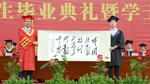為了感謝母校的培育之恩,2017屆畢業(yè)生向我校贈送書法作品“博聞強志承校訓(xùn),正道直行報師恩”作為永久的紀(jì)念。黨委書記龍治剛代表學(xué)校接受作品。