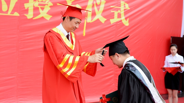 在學(xué)士學(xué)位授予儀式上,畢業(yè)生們依次走上主席臺,校長范新會、黨委副書記彭虎軍、副校長劉勇分別為獲得學(xué)士學(xué)位的畢業(yè)生正冠撥蘇、頒發(fā)學(xué)位證書,并與他們一一合影留念。