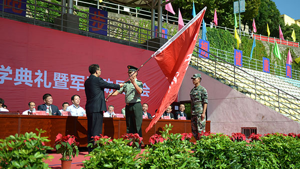 校黨委書記龍治剛為2017級學(xué)生軍訓(xùn)團授予團旗,馬防代表學(xué)生軍訓(xùn)團接旗。