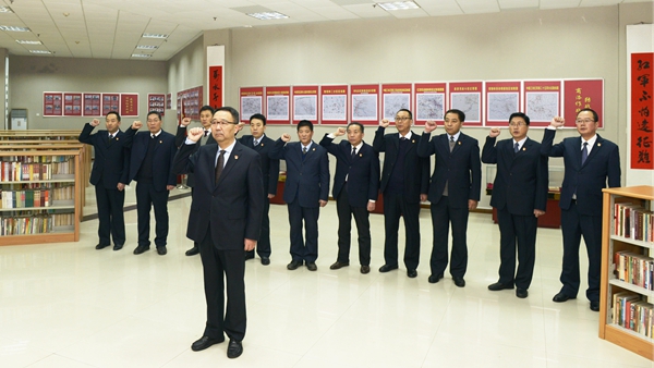 1月15日上午8時,中國共產(chǎn)黨商洛學(xué)院第二屆委員會委員龍治剛、范新會、王思懷、彭虎軍、劉寶盈、劉勇、王新軍、李超、楊存典、張向東、郭瑾,一起來到位于學(xué)校圖書館的商洛紅色文化資料館展廳,集體重溫入黨誓詞。在黨委書記龍治剛領(lǐng)誓下,黨委委員們舉起右拳,面對黨旗莊嚴(yán)宣誓。
