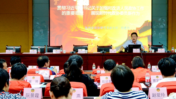 省政協(xié)研究室副主任周建功以《貫徹習近平總書記關于加強和改進人民政協(xié)工作的重要思想展現(xiàn)新時代政協(xié)委員新作為》為題為與會人員作專題輔導報告,他在報告中詳細解讀了習近平總書記關于加強和改進人民政協(xié)工作的重要思想,全面回顧了人民政協(xié)69年的光輝發(fā)展歷程,并就政協(xié)章程的修改、政協(xié)的十項經(jīng)常性工作、政協(xié)委員履職的基本要求等幾個方面作了深入系統(tǒng)的講解。