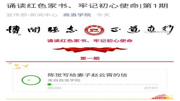 為了豐富“不忘初心、牢記使命”主題教育載體,引導(dǎo)廣大黨員重溫革命歷史、緬懷革命先烈、傳承紅色基因、牢記初心使命,宣傳部遴選了16封感人至深的紅色家書,16個(gè)基層黨總支、直屬黨支部組織黨員代表深情誦讀,并錄制音頻。誦讀作品包括家書作者簡介、家書原文和讀后感,是革命傳統(tǒng)教育的生動(dòng)素材。目前,部分誦讀作品已制作完成,為擴(kuò)大教育覆蓋面,今日起將通過“商洛學(xué)院”微信公眾號(hào)《誦讀紅色家書 牢記初心使命》欄目陸續(xù)推送,推送內(nèi)容除音頻外,還配有相關(guān)圖片和文字介紹。