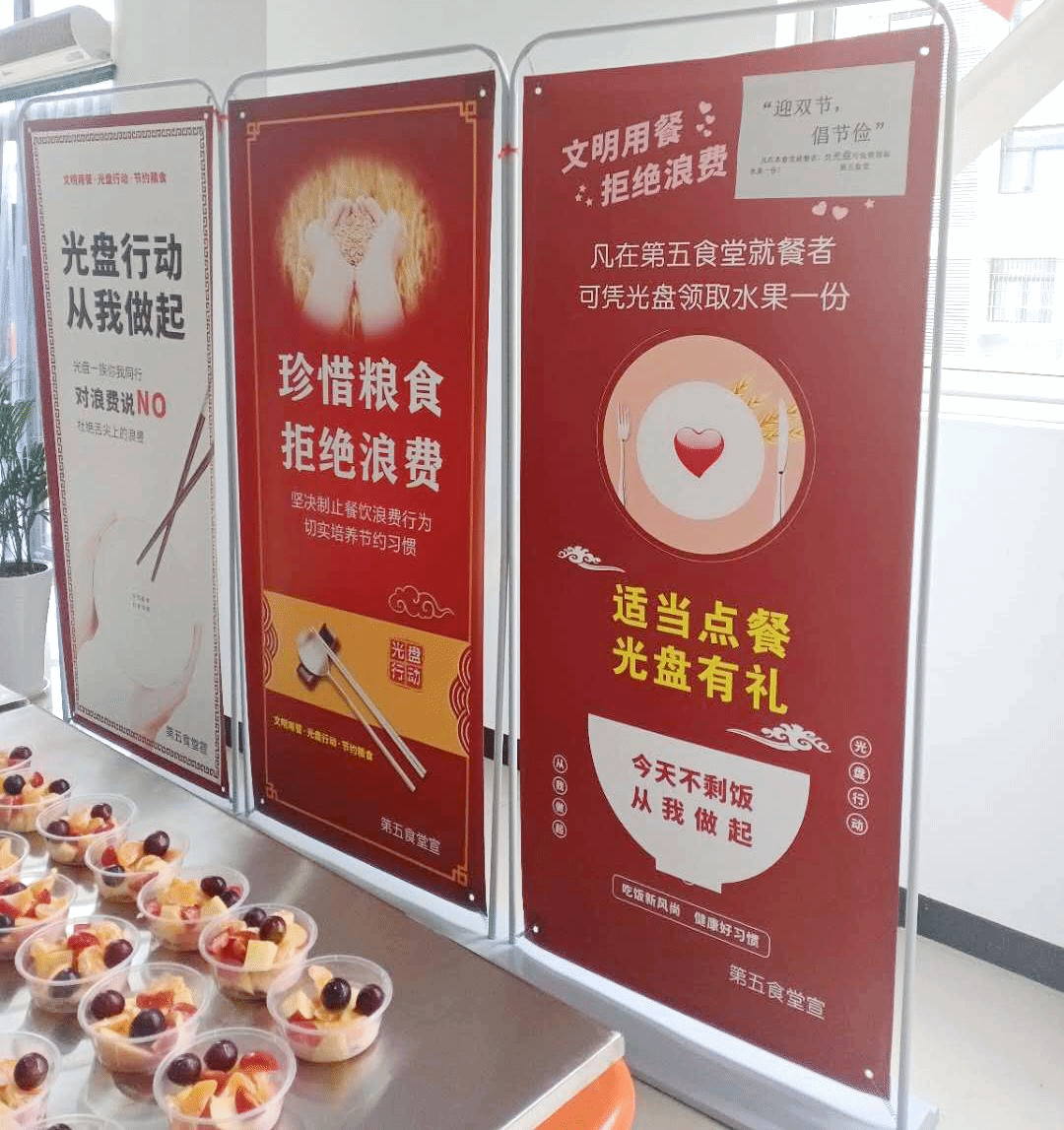 ——加強宣傳力度,營造濃厚氛圍。充分利用橫幅標語、海報掛圖、公告欄和微信公眾號等媒介,多種形式宣傳制止餐飲浪費,讓節(jié)約教育在全校食堂隨處可見,著力引導廣大師生培養(yǎng)健康文明的餐飲文化和勤儉節(jié)約的良好道德風尚。以開學為契機,把勤儉節(jié)約教育融入到文明就餐、光盤行動等活動中,引導學生樹立正確的世界觀、人生觀、價值觀。加強先進典型的正面宣傳,發(fā)揮榜樣示范作用,對浪費行為開展反面警示教育,加大對浪費行為的糾正力度。