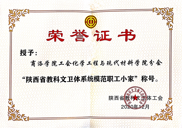 近日,陜西省教科文衛(wèi)體工會委員會發(fā)布了《關(guān)于表彰陜西省教科文衛(wèi)體系統(tǒng)模范職工之家、模范職工小家、優(yōu)秀工會工作者、優(yōu)秀工會積極分子、優(yōu)秀工會之友的通報》(陜教科文衛(wèi)體工字[2020]46號),校工會化材學(xué)院分會被授予陜西省科教文衛(wèi)體系統(tǒng)“模范職工小家”榮譽稱號。