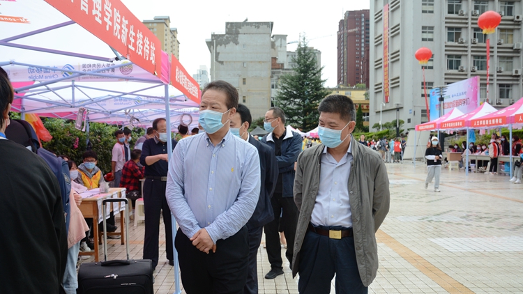 在黨委辦公室·院長(zhǎng)辦公室、學(xué)工部、教務(wù)處相關(guān)負(fù)責(zé)人的陪同下,張志昌、范新會(huì)一行來(lái)到各二級(jí)學(xué)院新生接待站,詳細(xì)了解新生報(bào)到情況,對(duì)工作人員和學(xué)生志愿者飽滿的精神狀態(tài)和熱情周到的服務(wù)給予充分肯定。校領(lǐng)導(dǎo)們還與現(xiàn)場(chǎng)報(bào)到的新生及家長(zhǎng)親切交談,詢問(wèn)他們對(duì)迎新工作的意見(jiàn)建議,叮囑新生要盡快適應(yīng)大學(xué)生活,積極做好職業(yè)規(guī)劃,精進(jìn)學(xué)業(yè),增長(zhǎng)才干,砥礪奮進(jìn),實(shí)現(xiàn)夢(mèng)想。
