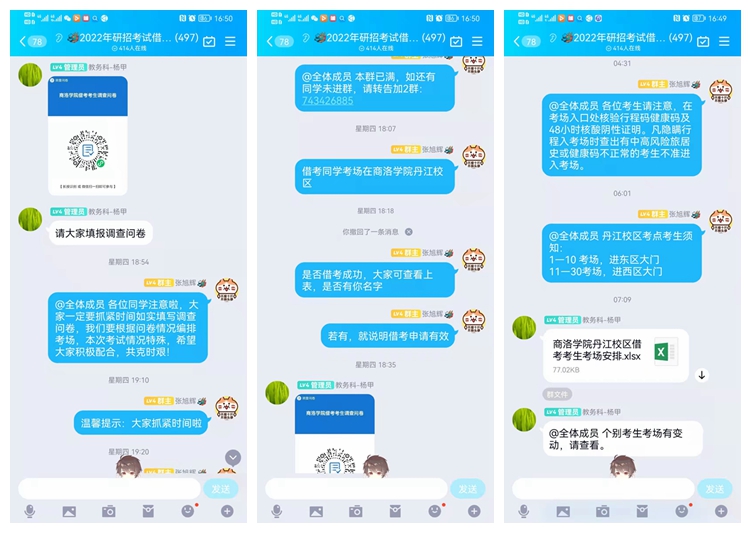 勇?lián)熑危慕M織考務工作。由于疫情影響,部分原考點在中高風險地區(qū)的考生無法前往考試,省教育考試院陸續(xù)安排我校借考考生從124人增加到778人,給考務工作帶來極大壓力。學校勇?lián)熑?,科學制定考務工作、疫情防控、后勤保障等各項預案。積極聯(lián)系地方政府和公安機關,由商州區(qū)公安分局開通綠色通道,安排公安人員與校內安保、考務人員全程押運,連續(xù)兩天前往試題印制及中轉地點領取借考考生試卷。最后一批試卷于25日凌晨4:30領回,十余名考務人員通宵等待、連夜分揀,確保第一場考試按時順利開考。負責借考考生咨詢QQ群的工作人員隨時關注政策變化,24小時在線為考生解惑答疑。一位借考考生表示,多虧學校工作做得細致,我們才能及時了解考試安排,懸著的心也放了下來。