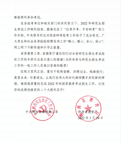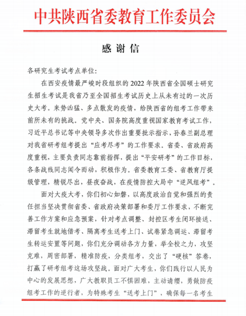 感謝信說,2022年研究生招生考試是我省乃至全國招生考試歷史上從未有過的一次歷史大考,來勢兇猛,多點散發(fā)的疫情給陜西省的組考工作帶來前所未有的挑戰(zhàn),面對大疫大考,我校初心如磐,以高度的政治自覺和強烈的責(zé)任擔(dān)當堅決貫徹省委、省政府決策部署和委廳工作要求,舉全校之力,攻堅克難,周密部署,精準防疫,分類組考,交出了“硬核”答卷,打贏了考研組考這場攻堅戰(zhàn),圓滿完成了“應(yīng)考盡考,平安考研”的工作目標。廣大考生和社會各界稱贊各項工作“精心、暖心、安心、放心”,網(wǎng)上網(wǎng)下不斷傳遞升華正能量。