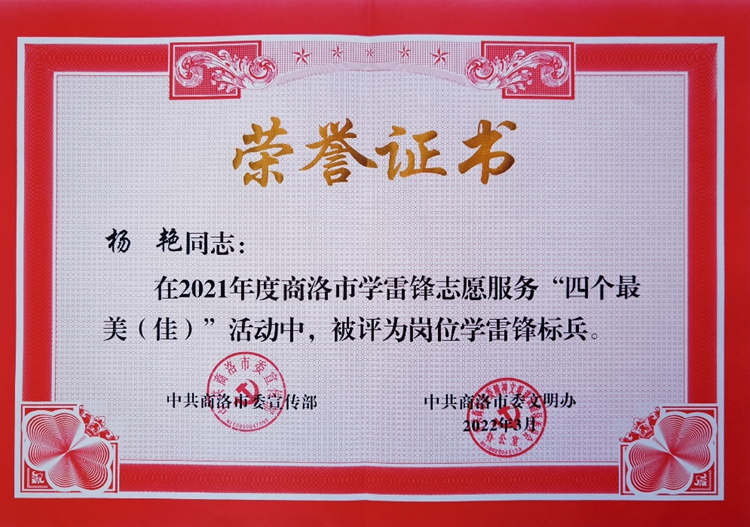 近日,商洛市委宣傳部和商洛市委文明辦公布了商洛市2021年度學(xué)雷鋒志愿服務(wù)“四個最美(佳)”活動先進典型名單,我校體育教學(xué)研究部教師楊艷榮獲“崗位學(xué)雷鋒標(biāo)兵”榮譽稱號。