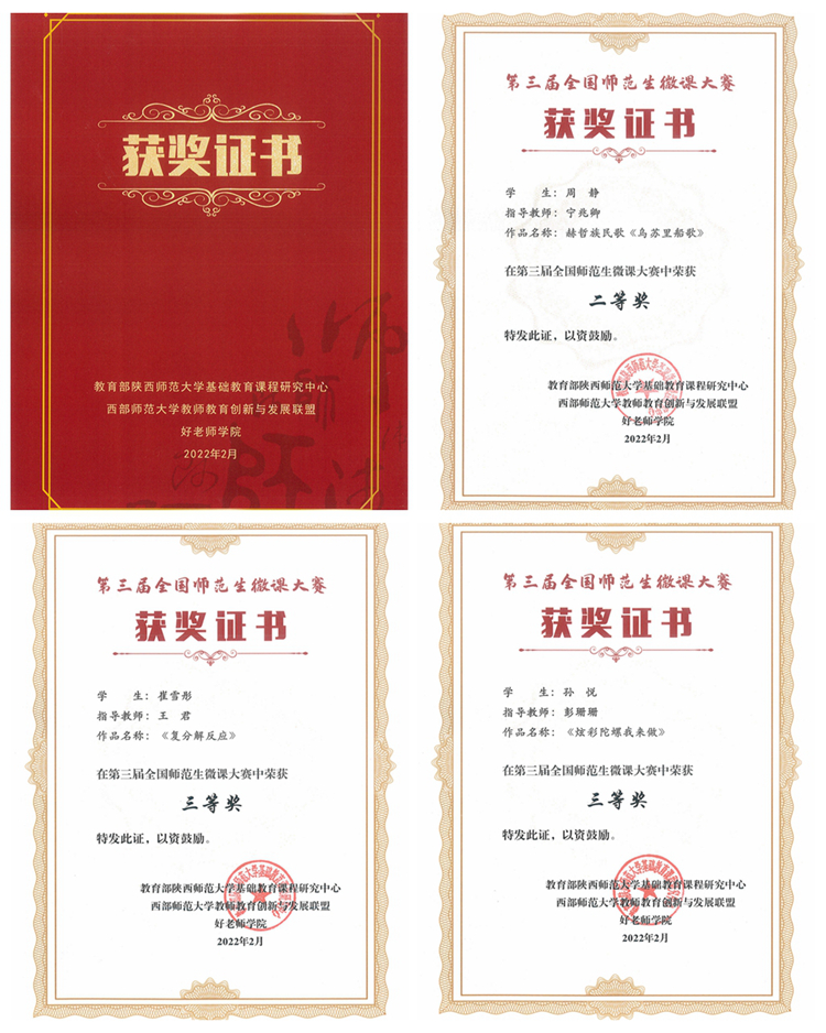 近日,第三屆全國師范生微課大賽結(jié)果公布。由我校教師寧兆卿指導、音樂學專業(yè)學生周靜完成的作品《赫哲族民歌<烏蘇里船歌>》榮獲二等獎,教師王君指導、化材學院學生崔雪彤完成的《復分解反應》以及教師彭珊珊指導、學前教育學專業(yè)學生孫悅完成的《炫彩陀螺我來做》獲三等獎。