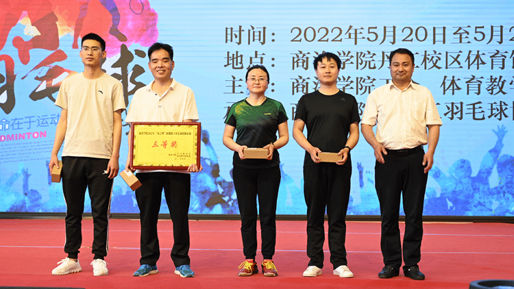 5月20-22日,由校工會(huì)、體育教學(xué)研究部主辦,教職工羽毛球協(xié)會(huì)承辦的2022年“虎之翼”杯教職工羽毛球團(tuán)體賽在丹江校區(qū)體育訓(xùn)練館舉行。校黨委副書記、工會(huì)主席彭虎軍,商洛市“虎之翼”科技有限公司總經(jīng)理劉珺,商洛學(xué)院附屬小學(xué)副校長(zhǎng)白鋒軍出席頒獎(jiǎng)儀式并為獲獎(jiǎng)代表隊(duì)頒獎(jiǎng)。