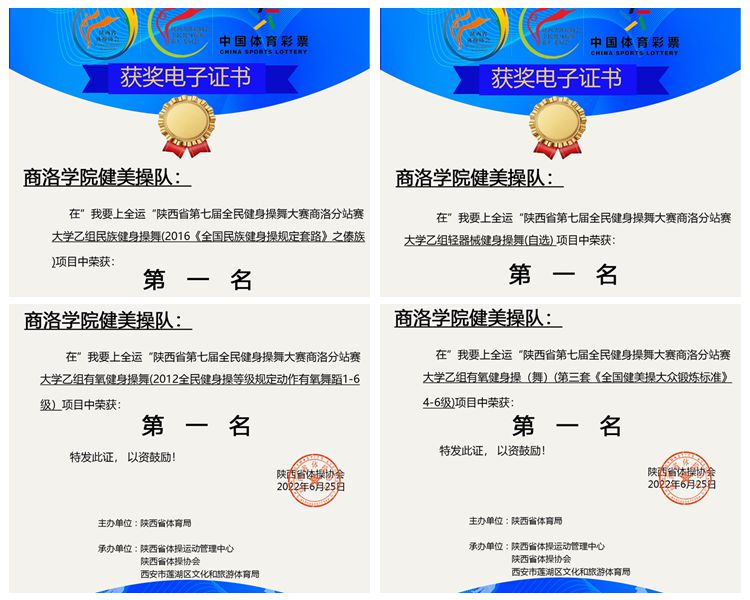 近期,陜西省第七屆全民健身操舞線上比賽圓滿落幕。我校派出由12名學生組建的健美操隊參加比賽,分別獲得大學乙組民族健身操舞(傣族舞)一等獎、輕器械健身操舞(自選)一等獎、有氧舞蹈一等獎及全國健美操大眾鍛煉標準(4-6級)一等獎的優(yōu)異成績,體育教學研究部教師張馨嬌被評為“優(yōu)秀教練員”。
