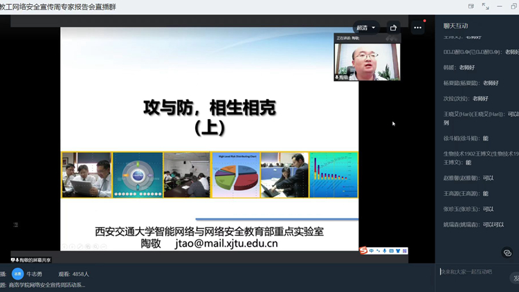為推動(dòng)第九屆網(wǎng)絡(luò)安全宣傳周活動(dòng)深入開展,提升師生網(wǎng)絡(luò)安全意識(shí)和防護(hù)技能,營(yíng)造網(wǎng)絡(luò)安全人人有責(zé)、網(wǎng)絡(luò)安全人人參與的濃厚氛圍,9月7日下午,我校通過線上平臺(tái)舉辦網(wǎng)絡(luò)安全知識(shí)專家報(bào)告會(huì)。大會(huì)邀請(qǐng)西安交通大學(xué)網(wǎng)絡(luò)空間安全學(xué)院副院長(zhǎng)、智能網(wǎng)絡(luò)與網(wǎng)絡(luò)安全教育部重點(diǎn)實(shí)驗(yàn)室副主任陶敬老師作了題為《攻與防,相生相克!》的專題報(bào)告。報(bào)告會(huì)由信息化建設(shè)與管理處負(fù)責(zé)人付軍昌主持,各單位網(wǎng)絡(luò)安全和信息化工作負(fù)責(zé)人、網(wǎng)絡(luò)安全和信息化專員,教師代表及2019、2020、2021級(jí)全體學(xué)生5000余人線上參加報(bào)告會(huì)。