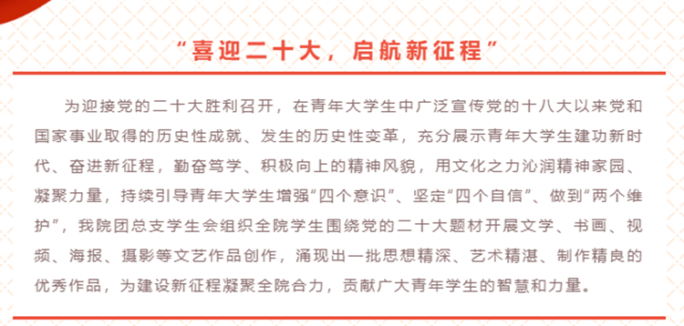 城鄉(xiāng)規(guī)劃與建筑工程學院舉辦了“喜迎黨的二十大,啟航新征程”活動,通過展現(xiàn)學生自行創(chuàng)作的黨的二十大題材文學、書畫、視頻、海報、攝影等文藝作品,充分展示了青年大學生奮進新征程、建功新時代,勤奮篤學、積極向上的精神風貌。
